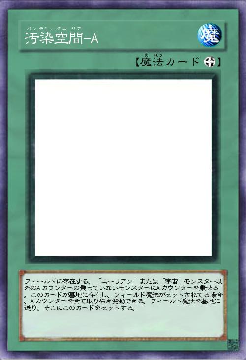 | フィールドに存在する、「エーリアン」または「宇宙」モンスター以外のAカウンターの乗っていないモンスターにAカウンターを乗せる。このカードが墓地に存在し、フィールド魔法がセットされてる場合、Aカウンターを全て取り除き発動できる。フィールド魔法を墓地に送り、そこにこのカードをセットする。 | |||