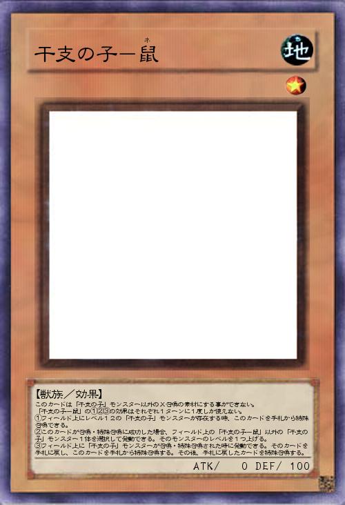| このカードは「干支の子」モンスター以外のX召喚の素材にする事ができない。 「干支の子-鼠」の①②③の効果はそれぞれ1ターンに1度しか使えない。 ①フィールド上にレベル12の「干支の子」モンスターが存在する時、このカードを手札から特殊召喚できる。 ②このカードが召喚・特殊召喚に成功した場合、フィールド上の「干支の子-鼠」以外の「干支の子」モンスター1体を選択して発動できる。そのモンスターのレベルを1つ上げる。 ③フィールド上に「干支の子」モンスターが召喚・特殊召喚された時に発動できる。そのカードを手札に戻し、このカードを手札から特殊召喚する。その後、手札に戻したカードを特殊召喚する。 | |||