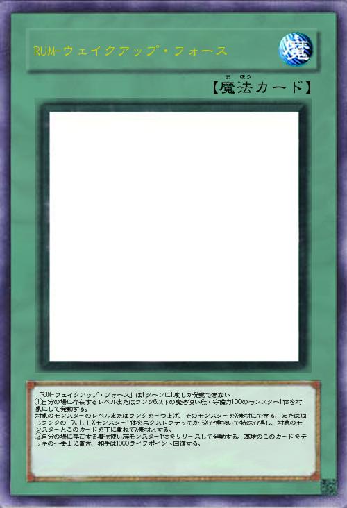 | 「RUM-ウェイクアップ・フォース」は1ターンに1度しか発動できない ①自分の場に存在するレベルまたはランク6以下の魔法使い族・守備力100のモンスター1体を対象にして発動する。 対象のモンスターのレベルまたはランクを一つ上げ、そのモンスターをX素材にできる、または同じランクの「A.I.」Xモンスター1体をエクストラデッキからX召喚扱いで特殊召喚し、対象のモンスターとこのカードを下に重ねてX素材とする。 ②自分の場に存在する「A.I.」モンスター1体をリリースして発動する。墓地のこのカードをデッキの一番上に置き、相手は1000ライフポイント回復する。 | |||