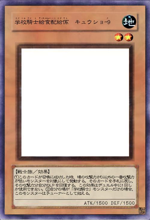 | ①このカードが召喚に成功した時、場の攻撃力が0以外の一番攻撃力が低いモンスターを対象にして発動する。そのカードを手札に戻し、その攻撃力分自分のLPを回復する。この効果はデュエル中に1回しか使用できない。②自分の場が「学校騎士」モンスターだけの場合、このモンスターはチューナーとして扱える。 | |||