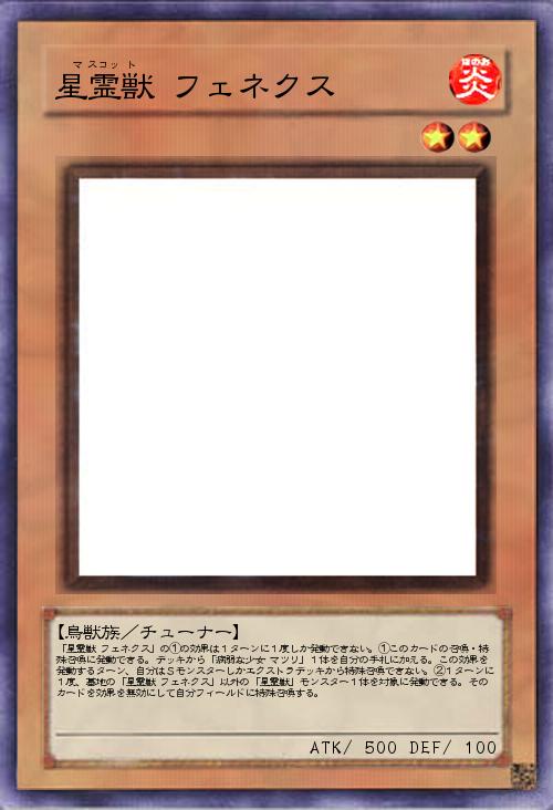 | 「星霊獣 フェネクス」の①の効果は1ターンに1度しか発動できない。①このカードの召喚・特殊召喚に発動できる。デッキから「病弱な少女 マツリ」1体を自分の手札に加える。この効果を発動するターン、自分はSモンスターしかエクストラデッキから特殊召喚できない。②1ターンに1度、墓地の「星霊獣 フェネクス」以外の「星霊獣」モンスター1体を対象に発動できる。そのカードを効果を無効にして自分フィールドに特殊召喚する。 | |||