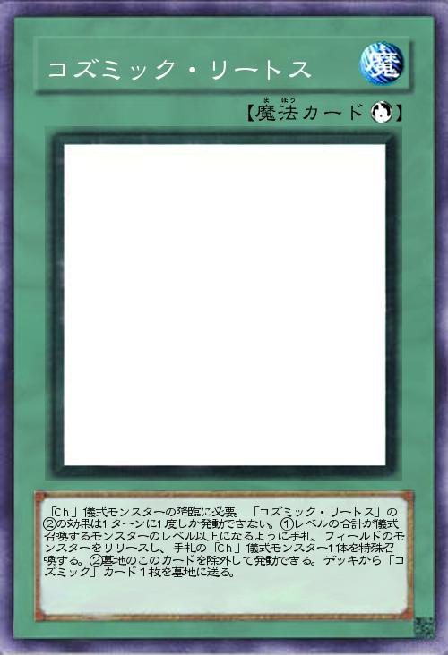 | 「Ch」儀式モンスターの降臨に必要。「コズミック・リートス」の②の効果は1ターンに1度しか発動できない。①レベルの合計が儀式召喚するモンスターのレベル以上になるように手札、フィールドのモンスターをリリースし、手札の「Ch」儀式モンスター1体を特殊召喚する。②墓地のこのカードを除外して発動できる。デッキから「コズミック」カード1枚を墓地に送る。 | |||