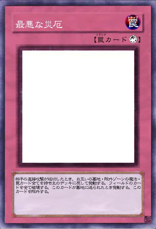 | 相手の直接攻撃が成功したとき、お互いの墓地・除外ゾーンの魔法・罠カード全てを持ち主のデッキに戻して発動する。フィールドのカードを全て破壊する。このカードが墓地に送られたとき発動する。このカードを除外する。 | |||