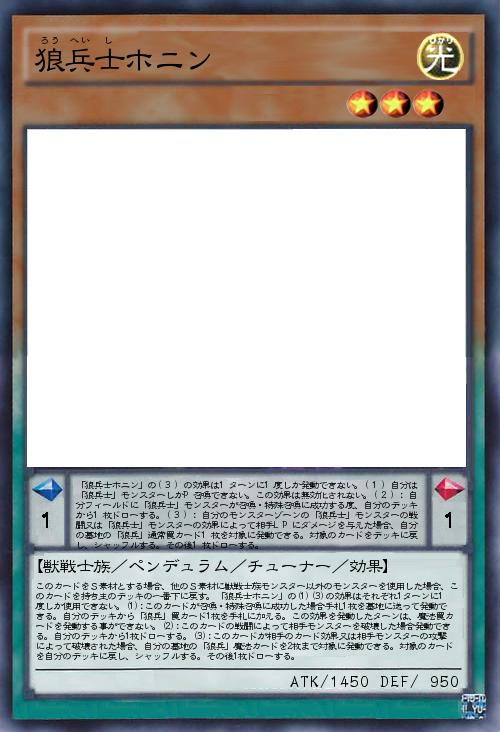| このカードをS素材とする場合、他のS素材に獣戦士族モンスター以外のモンスターを使用した場合、このカードを持ち主のデッキの一番下に戻す。「狼兵士ホニン」の(1)(3)の効果はそれぞれ1ターンに1度しか使用できない。(1):このカードが召喚・特殊召喚に成功した場合手札1枚を墓地に送って発動できる。自分のデッキから「狼兵」罠カード1枚を手札に加える。この効果を発動したターンは、魔法罠カードを発動する事ができない。(2):このカードの戦闘によって相手モンスターを破壊した場合発動できる。自分のデッキから1枚ドローする。(3):このカードが相手のカード効果又は相手モンスターの攻撃によって破壊された場合、自分の墓地の「狼兵」魔法カードを2枚まで対象に発動できる。対象のカードを自分のデッキに戻し、シャッフルする。その後1枚ドローする。 | |||