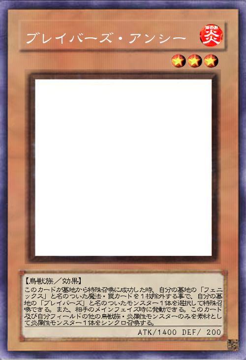 | このカードが墓地から特殊召喚に成功した時、自分の墓地の「フェニックス」と名のついた魔法・罠カードを1枚除外する事で、自分の墓地の「ブレイバーズ」と名のついたモンスター1体を選択して特殊召喚できる。また、相手のメインフェイズ時に発動できる。このカード及び自分フィールドの他の鳥獣族・炎属性モンスターのみを素材として炎属性モンスター1体をシンクロ召喚する。 | |||