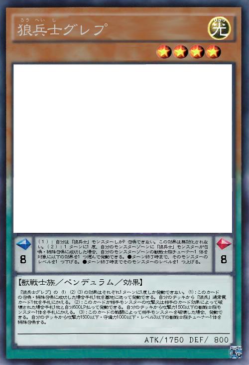 | 「狼兵士グレプ」の(1)(2)(3)の効果はそれぞれ1ターンに1度しか発動できない。(1):このカードの召喚・特殊召喚に成功した場合手札1枚を墓地に送って発動できる。自分のデッキから「狼兵」通常罠カード1枚を手札に加える。(2):このカードが相手モンスターの攻撃又は相手のカード効果によって破壊された場合手札1枚と自分800LP払って発動できる。自分のデッキから攻撃力1500以下の獣戦士族モンスター1体を手札に加える。(3):このカードの戦闘によって相手モンスターを破壊した場合、発動できる。自分のデッキから攻撃力1500以下・守備力1000以下・レベル3以下の獣戦士族チューナー1体を特殊召喚する。 | |||
