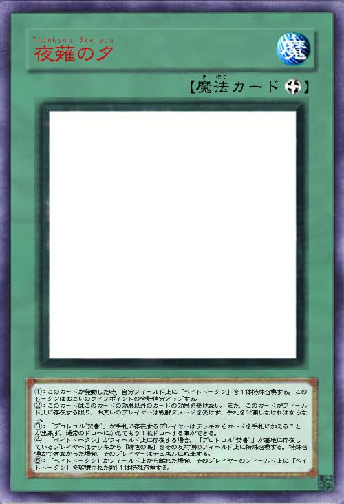 | ①:このカードが発動した時、自分フィールド上に「ベイトトークン」を1体特殊召喚する。このトークンはお互いのライフポイントの合計値分アップする。 ②:このカードはこのカードの効果以外のカードの効果を受けない。また、このカードがフィールド上に存在する限り、お互いのプレイヤーは戦闘ダメージを受けず、手札を公開しなければならない。 ③:「プロトコル"焚書"」が手札に存在するプレイヤーはデッキからカードを手札に加えることが出来ず、通常のドローに加えてもう1枚ドローする事ができる。 ④:「ベイトトークン」がフィールド上に存在する場合、「プロトコル"焚書"」が墓地に存在しているプレイヤーはデッキから「緋色の鳥」をその反対側のフィールド上に特殊召喚する。特殊召喚ができなかった場合、そのプレイヤーはデュエルに敗北する。 ⑤:「ベイトトークン」がフィールド上から離れた場合、そのプレイヤーのフィールド上に「ベイ | |||