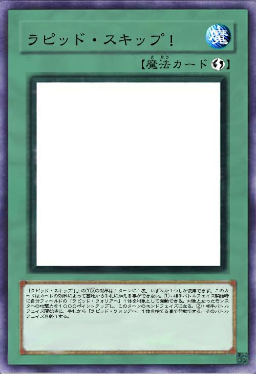 | 「ラピッド・スキップ!」の①②の効果は1ターンに1度、いずれか1つしか使用できず、このカードはカードの効果によって墓地から手札に加える事ができない。①:相手バトルフェイズ開始時に自分フィールドの「ラピッド・ウォリアー」1体を対象として発動できる。対象となったモンスターの攻撃力を1000ポイントアップし、このターンのエンドフェイズになる。②:相手バトルフェイズ開始時に、手札から「ラピッド・ウォリアー」1体を捨てる事で発動できる。そのバトルフェイズを終了する。 | |||
