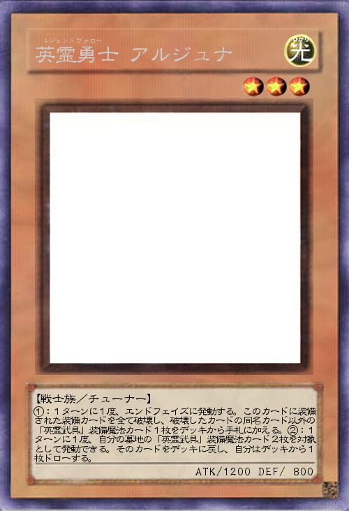 | ①:1ターンに1度、エンドフェイズに発動する。このカードに装備された装備カードを全て破壊し、破壊したカードの同名カード以外の「英霊武具」装備魔法カード1枚をデッキから手札に加える。②:1ターンに1度、自分の墓地の「英霊武具」装備魔法カード2枚を対象として発動できる。そのカードをデッキに戻し、自分はデッキから1枚ドローする。 | |||