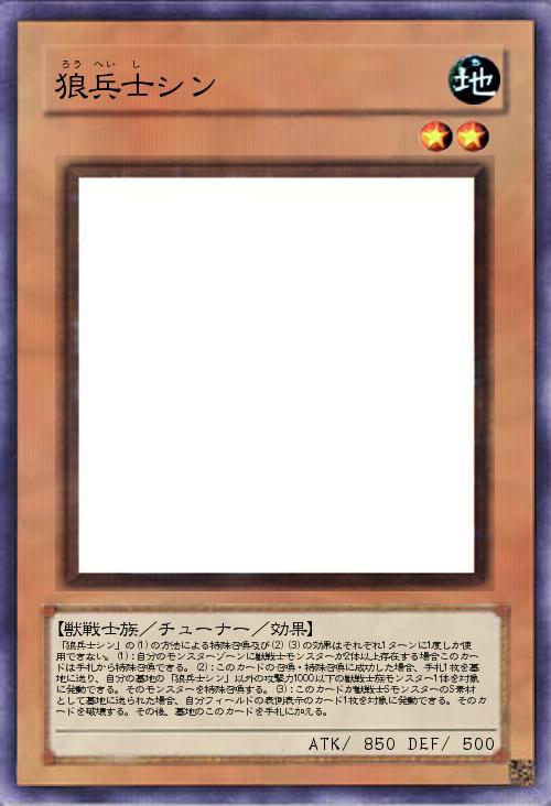 | 「狼兵士シン」の(1)の方法による特殊召喚及び(2)(3)の効果はそれぞれ1ターンに1度しか使用できない。(1):自分のモンスターゾーンに獣戦士モンスターが2体以上存在する場合このカードは手札から特殊召喚できる。(2):このカードの召喚・特殊召喚に成功した場合、手札1枚を墓地に送り、自分の墓地の「狼兵士シン」以外の攻撃力1000以下の獣戦士族モンスター1体を対象に発動できる。そのモンスターを特殊召喚する。(3):このカードが獣戦士SモンスターのS素材として墓地に送られた場合、自分フィールドの表側表示のカード1枚を対象に発動できる。そのカードを破壊する。その後、墓地のこのカードを手札に加える。 | |||