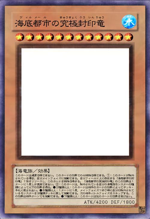 | このカードは通常召喚できない。このカードの効果でのみ特殊召喚できる。①:このカードが除外されている場合、自分メインフェイズに発動できる。自分フィールド上に存在する「海底都市の封印竜」1体をリリースし、このカードを特殊召喚する。「海底都市の究極封印竜」のこの効果は1ターンに1度しか使用できない。②:このカードは、除外されている自分の海竜族モンスターの種類によって以下の効果を得る。●2種類以上:このカードは相手のカードの効果によってデッキ・手札に戻されない。●5種類以上:1ターンに1度、メインフェイズ1終了時に自分の除外されているモンスターを3種類デッキに戻して発動できる。次の相手バトルフェイズをスキップする。この効果は相手ターンでも発動できる。●7種類以上:このカードは他のカードの効果を受けない。 | |||