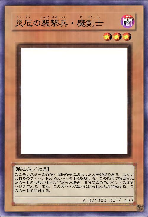| このモンスターの召喚・反転召喚に成功したとき発動できる。お互いは自身のフィールドからカードを1枚破壊する。この効果で破壊されたカードの枚数が1枚以下だった場合、自分に400ポイントのダメージを与える。また、このカードが墓地に送られたとき発動する。このカードを除外する。 | |||