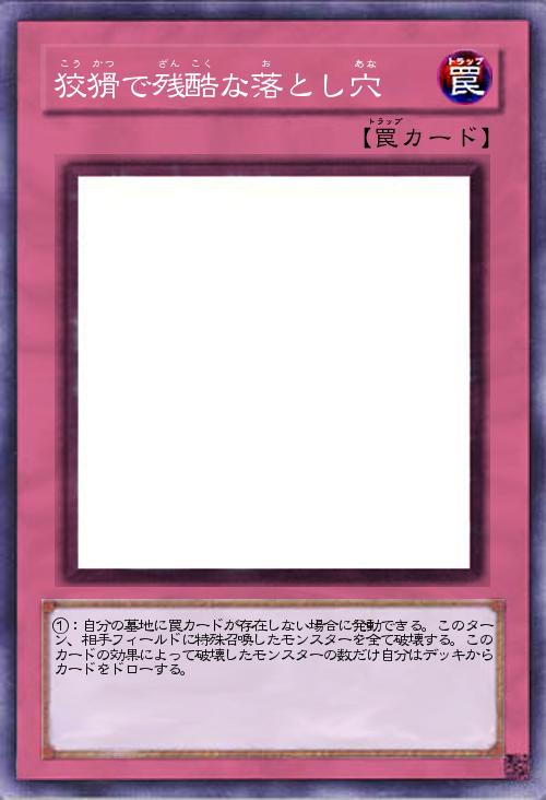 | ①:自分の墓地に罠カードが存在しない場合に発動できる。このターン、相手フィールドに特殊召喚したモンスターを全て破壊する。このカードの効果によって破壊したモンスターの数だけ自分はデッキからカードをドローする。 | |||