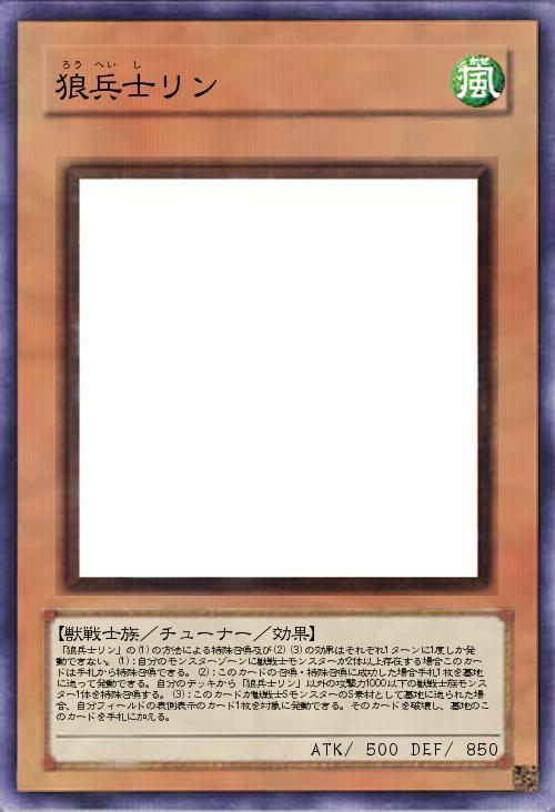 | 「狼兵士リン」の(1)の方法による特殊召喚及び(2)(3)の効果はそれぞれ1ターンに1度しか発動できない。(1):自分のモンスターゾーンに獣戦士モンスターが2体以上存在する場合このカードは手札から特殊召喚できる。(2):このカードの召喚・特殊召喚に成功した場合手札1枚を墓地に送って発動できる。自分のデッキから「狼兵士リン」以外の攻撃力1000以下の獣戦士族モンスター1体を特殊召喚する。(3):このカードが獣戦士SモンスターのS素材として墓地に送られた場合、自分フィールドの表側表示のカード1枚を対象に発動できる。そのカードを破壊し、墓地のこのカードを手札に加える。 | |||