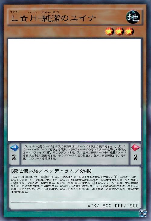 | 「L☆H-純潔のユイナ」の②のP効果は1ターンに1度しか使用できない。①:このカードがPゾーンに存在する限り、相手フィールドのモンスターの攻撃力・守備力はバトルフェイズの間、500ダウンする。②:自分が相手ターン中に戦闘ダメージを受けた場合に発動できる。そのダメージの倍の数値分、自分LPを回復する。その後、このカードを破壊する。 | |||