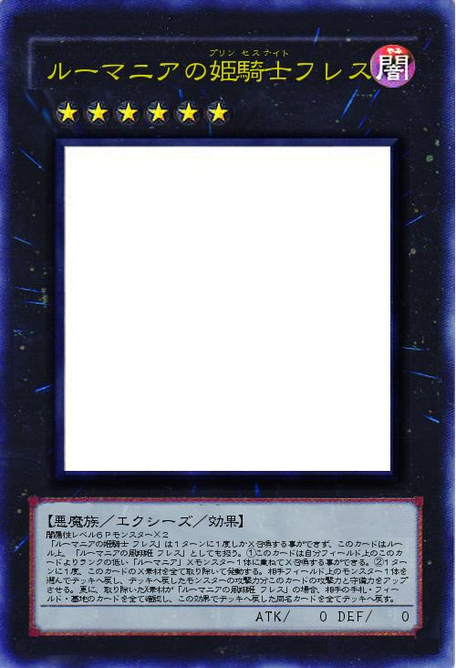 | 闇属性レベル6Pモンスター×2 「ルーマニアの姫騎士 フレス」は1ターンに1度しかX召喚する事ができず、このカードはルール上、「ルーマニアの風翔姫 フレス」としても扱う。①このカードは自分フィールド上のこのカードよりランクの低い「ルーマニア」Xモンスター1体に重ねてX召喚する事ができる。②1ターンに1度、このカードのX素材を全て取り除いて発動する。相手フィールド上のモンスター1体を選んでデッキへ戻し、デッキへ戻したモンスターの攻撃力分このカードの攻撃力と守備力をアップさせる。更に、取り除いたX素材が「ルーマニアの風翔姫 フレス」の場合、相手の手札・フィールド・墓地のカードを全て確認し、この効果でデッキへ戻した同名カードを全てデッキへ戻す。 | |||