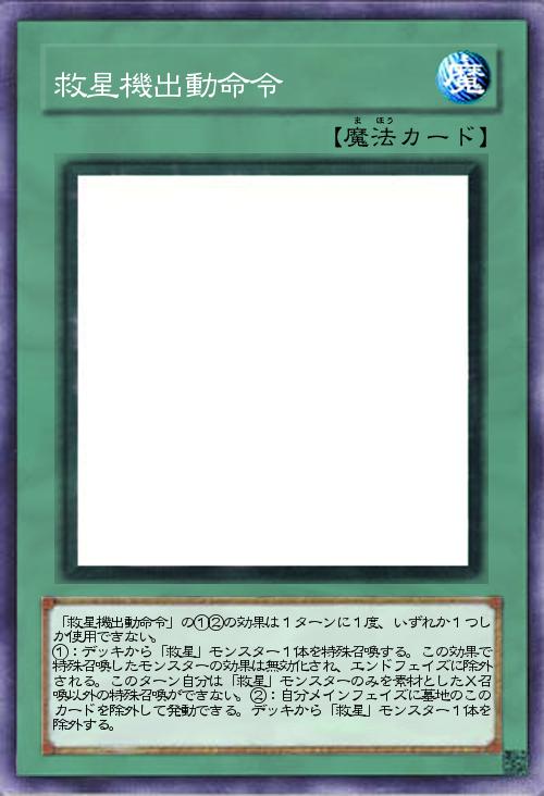 | 「救星機出動命令」の①②の効果は1ターンに1度、いずれか1つしか使用できない。 ①:デッキから「救星」モンスター1体を特殊召喚する。この効果で特殊召喚したモンスターの効果は無効化され、エンドフェイズに除外される。このターン自分は「救星」モンスターのみを素材としたX召喚以外の特殊召喚ができない。②:自分メインフェイズに墓地のこのカードを除外して発動できる。デッキから「救星」モンスター1体を除外する。 | |||