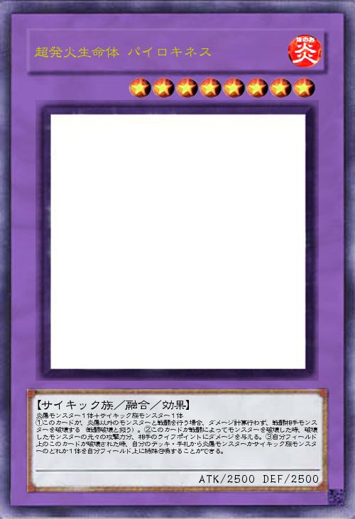| 炎属モンスター1体+サイキック族モンスター1体 ①このカードが、炎属以外のモンスターと戦闘を行う場合、ダメージ計算行わず、戦闘相手モンスターを破壊する(戦闘破壊と扱う)。②このカードが戦闘によってモンスターを破壊した時、破壊したモンスターの元々の攻撃力分、相手のライフポイントにダメージを与える。③自分フィールド上のこのカードが破壊された時、自分のデッキ・手札から炎属モンスターかサイキック族モンスターのどれか1体を自分フィールド上に特殊召喚することができる。 | |||