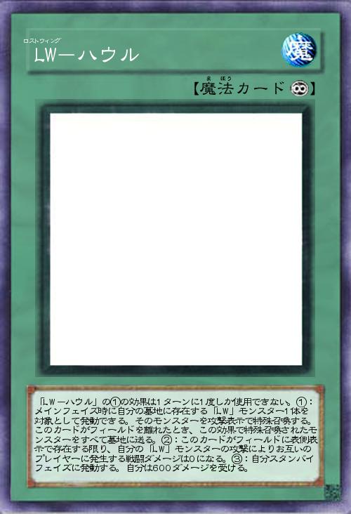 | 「LW-ハウル」の①の効果は1ターンに1度しか使用できない。①:メインフェイズ時に自分の墓地に存在する「LW」モンスター1体を対象として発動できる。そのモンスターを攻撃表示で特殊召喚する。このカードがフィールドを離れたとき、この効果で特殊召喚されたモンスターをすべて墓地に送る。②:このカードがフィールドに表側表示で存在する限り、自分の「LW」モンスターの攻撃によりお互いのプレイヤーに発生する戦闘ダメージは0になる。③:自分スタンバイフェイズに発動する。自分は600ダメージを受ける。 | |||
