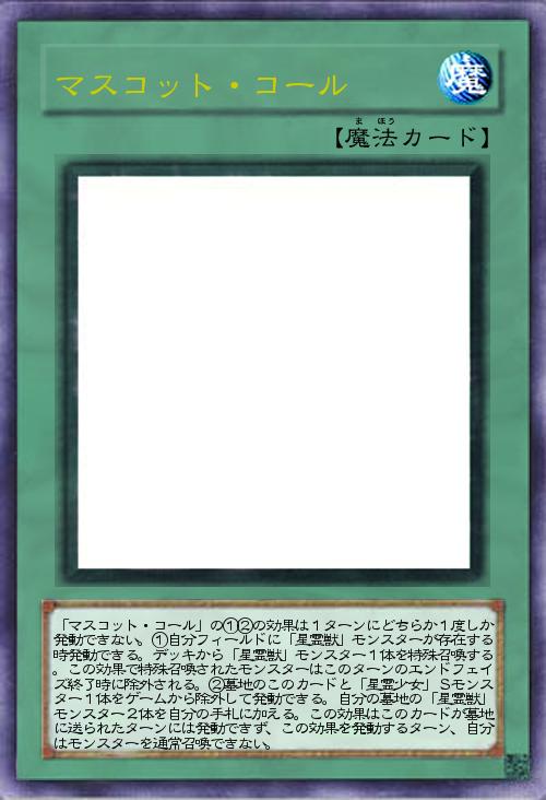 | 「マスコット・コール」の①②の効果は1ターンにどちらか1度しか発動できない。①自分フィールドに「星霊獣」モンスターが存在する時発動できる。デッキから「星霊獣」モンスター1体を特殊召喚する。この効果で特殊召喚されたモンスターはこのターンのエンドフェイズ終了時に除外される。②墓地のこのカードと「星霊少女」Sモンスター1体をゲームから除外して発動できる。自分の墓地の「星霊獣」モンスター2体を自分の手札に加える。この効果はこのカードが墓地に送られたターンには発動できず、この効果を発動するターン、自分はモンスターを通常召喚できない。 | |||