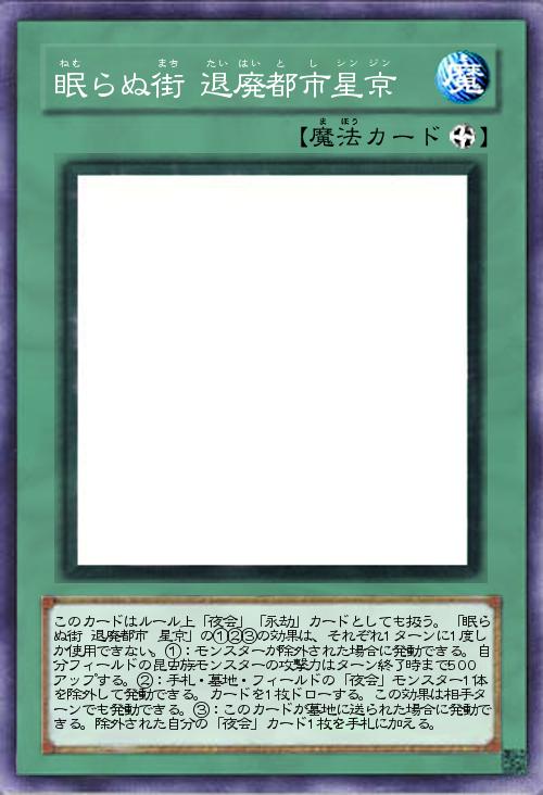 | このカードはルール上「夜会」「永劫」カードとしても扱う。「眠らぬ街 退廃都市 星京」の①②③の効果は、それぞれ1ターンに1度しか使用できない。①:モンスターが除外された場合に発動できる。自分フィールドの昆虫族モンスターの攻撃力はターン終了時まで500アップする。②:手札・墓地・フィールドの「夜会」モンスター1体を除外して発動できる。カードを1枚ドローする。この効果は相手ターンでも発動できる。③:このカードが墓地に送られた場合に発動できる。除外された自分の「夜会」カード1枚を手札に加える。 | |||