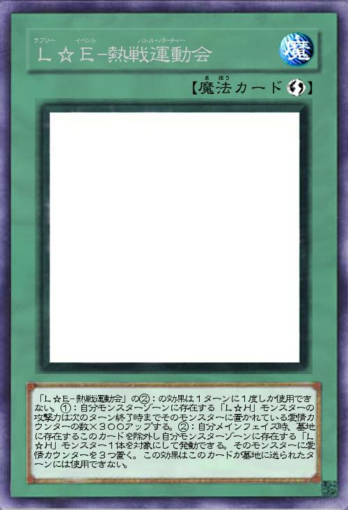 | 「L☆E-熱戦運動会」の②:の効果は1ターンに1度しか使用できない。①:自分モンスターゾーンに存在する「L☆H」モンスターの攻撃力は次のターン終了時までそのモンスターに置かれている愛情カウンターの数×300アップする。②:自分メインフェイズ時、墓地に存在するこのカードを除外し自分モンスターゾーンに存在する「L☆H」モンスター1体を対象にして発動できる。そのモンスターに愛情カウンターを3つ置く。この効果はこのカードが墓地に送られたターンには使用できない。 | |||
