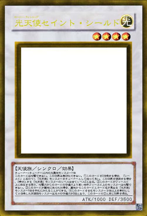 | チューナー+チューナー以外の光属性モンスター1体 このカードは攻撃できない。この効果は無効化できない。①このカードをS召喚する場合、「シールド」と名のつく「光天使」モンスターをチューナーとして扱って良い。この効果を使用する場合、S素材とする「光天使」モンスターのレベルは全てレベル2となる。②このカードがフィールド上に存在する限り、攻撃力がこのカードの守備力より高い相手フィールド上のモンスターは攻撃できない。③このカードが墓地に送られた場合、墓地からこのカードとカード名が異なる「光天使」モンスター1体を手札に加えることができる。④このカードを含むモンスター3体以上を素材としてX召喚した天使族モンスターは元々の守備力が2倍となり、このカードの②と同じ効果を得る。 | |||