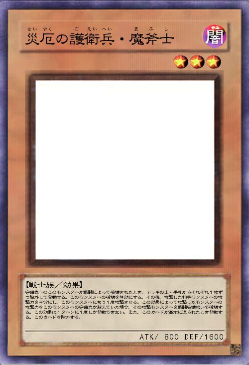 | 守備表示のこのモンスターが戦闘によって破壊されたとき、デッキの上・手札からそれぞれ1枚ずつ除外して発動する。このモンスターの破壊を無効にする。その後、攻撃した相手モンスターの攻撃力を半分にし、このモンスターにもう1度攻撃させる。この効果によって攻撃したモンスターの攻撃力をこのモンスターの守備力が超えていた場合、その攻撃モンスターを戦闘破壊扱いで破壊する。この効果は1ターンに1度しか発動できない。また、このカードが墓地に送られたとき発動する。このカードを除外する。 | |||