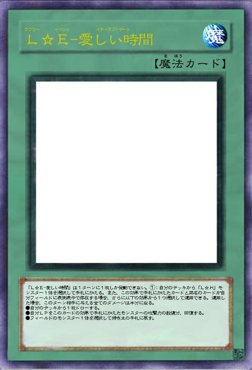 | 「L☆E-愛しい時間」は1ターンに1枚しか発動できない。①:自分のデッキから「L☆H」モンスター1体を選択して手札に加える。また、この効果で手札に加えたカードと同名のカードが自分フィールドに表側表示で存在する場合、さらに以下の効果から1つ選択して適用できる。適用した場合、このターン相手に与える全てのダメージは半分になる。 ●自分のデッキから1枚ドローする。 ●自分LPをこのカードの効果で手札に加えたモンスターの攻撃力の数値分、回復する。 ●フィールドのモンスター1体を選択して持ち主の手札に戻す。 | |||