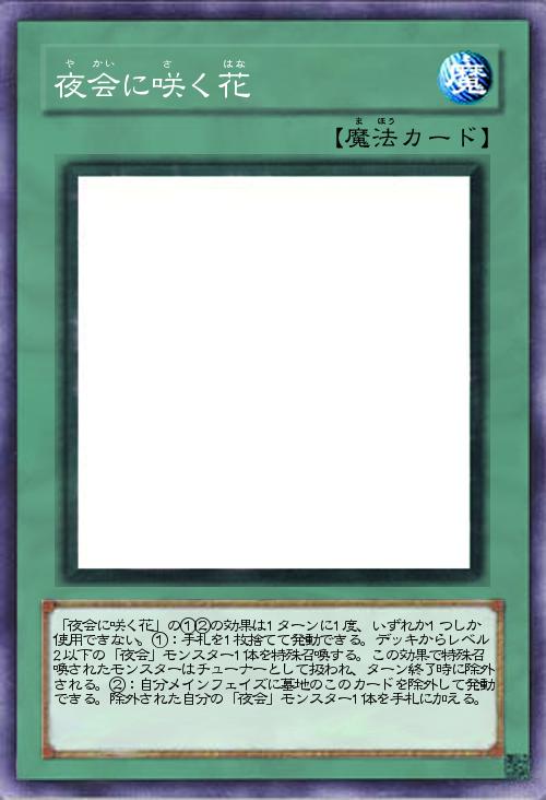 | 「夜会に咲く花」の①②の効果は1ターンに1度、いずれか1つしか使用できない。①:手札を1枚捨てて発動できる。デッキからレベル2以下の「夜会」モンスター1体を特殊召喚する。この効果で特殊召喚されたモンスターはチューナーとして扱われ、ターン終了時に除外される。②:自分メインフェイズに墓地のこのカードを除外して発動できる。除外された自分の「夜会」モンスター1体を手札に加える。 | |||