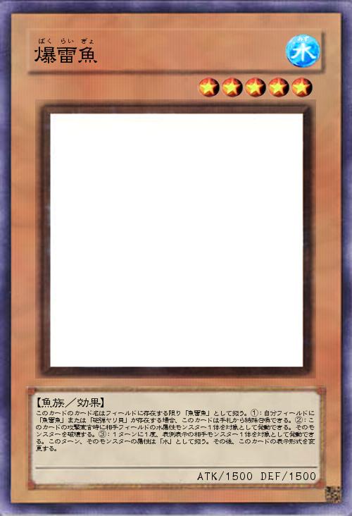| このカードのカード名はフィールドに存在する限り「魚雷魚」として扱う。①:自分フィールドに「魚雷魚」または「砲弾ヤリ貝」が存在する場合、このカードは手札から特殊召喚できる。②:このカードの攻撃宣言時に相手フィールドの水属性モンスター1体を対象として発動できる。そのモンスターを破壊する。③:1ターンに1度、表側表示の相手モンスター1体を対象として発動できる。このターン、そのモンスターの属性は「水」として扱う。その後、このカードの表示形式を変更する。 | |||
