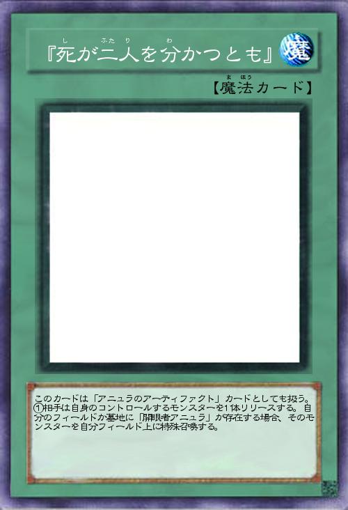 | このカードは「アニュラのアーティファクト」カードとしても扱う。①相手は自身のコントロールするモンスターを1体リリースする。自分のフィールドか墓地に「開眼者アニュラ」が存在する場合、そのモンスターを自分フィールド上に特殊召喚する。 | |||