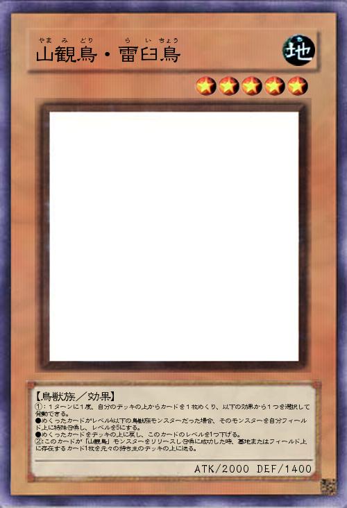 | ①:1ターンに1度、自分のデッキの上からカードを1枚めくり、以下の効果から1つを選択して発動できる。 ●めくったカードがレベル4以下の鳥獣族モンスターだった場合、そのモンスターを自分フィールド上に特殊召喚し、レベルを5にする。 ●めくったカードをデッキの上に戻し、このカードのレベルを1つ下げる。 ②:このカードが「山観鳥」モンスターをリリースし召喚に成功した時、墓地またはフィールド上に存在するカード1枚を元々の持ち主のデッキの上に送る。 | |||