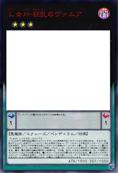 | 「L☆H」レベル3モンスター×2 レベル3がP召喚可能な場合にエクストラデッキの表側表示のこのカードはP召喚できる。「L☆H-狂乱のヴァムア」は自分フィールドに1枚しか存在できない。①:このカードが自分モンスターゾーンに存在する限り、自分LPが回復する度にこのカードに愛情カウンターを1つ置く。②:このカードに置かれている愛情カウンターはX素材として使用してもよい。③:このカードのX素材を2つ取り除いて発動できる。魔法・罠の効果の発動を無効にし破壊する。その後、自分LPを800回復する。④:P召喚されたこのカードは以下の効果を得る。●このカードの元々の攻撃力は3000になる。●このカードがモンスターゾーンに存在する限り、このカードのランクより高いレベル・ランクを持つモンスターゾーンに存在するモンスターの効果は無効になり、攻撃力・守備力は500ダウンする。 | |||