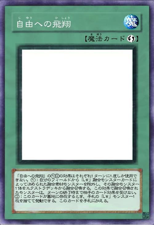 | 「自由への飛翔」の①②の効果はそれぞれ1ターンに1度しか使用できない。①:自分のフィールドから「LW」融合モンスターカードによって決められた融合素材モンスターを除外し、その融合モンスター1体をエクストラデッキから融合召喚する。この効果で融合召喚されたモンスターは、ターンの終了時まで相手のカード効果を受けない。②:このカードが墓地に存在するとき、手札の「LW」モンスター1枚を捨てて発動できる。このカードを手札に加える。 | |||