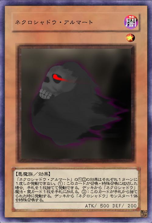 | 「ネクロシャドウ・アルマート」の①②の効果はそれぞれ1ターンに1度しか発動できない。①:このカードが召喚・特殊召喚に成功した場合、手札を1枚捨てて発動できる。デッキから「ネクロシャドウ」魔法・罠カード1枚を手札に加える。②:このカードが手札から捨てられた時に発動する。デッキから「ネクロシャドウ」モンスター1体を特殊召喚する。 | |||