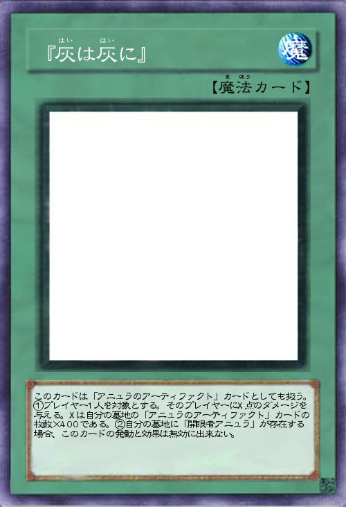 | このカードは「アニュラのアーティファクト」カードとしても扱う。①プレイヤー1人を対象とする。そのプレイヤーにX点のダメージを与える。Xは自分の墓地の「アニュラのアーティファクト」カードの枚数×400である。②自分の墓地に「開眼者アニュラ」が存在する場合、このカードの発動と効果は無効に出来ない。 | |||
