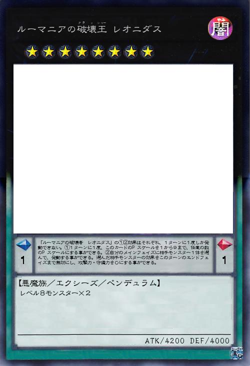| 「ルーマニアの破壊者 レオニダス」の①②効果はそれぞれ、1ターンに1度しか発動できない。①1ターンに1度、このカードのPスケールを1から9まで、任意の数のPスケールにする事ができる。②自分のメインフェイズに相手モンスター1体を選んで、発動する事ができる。選んだ相手モンスターの効果をこのターンのエンドフェイズまで無効にし、攻撃力・守備力を0にする事ができる。 | |||