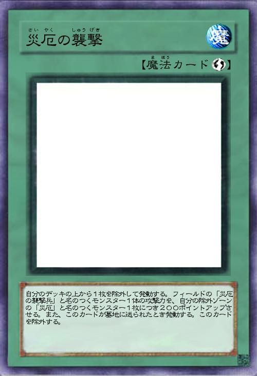 | 自分のデッキの上から1枚を除外して発動する。フィールドの「災厄の襲撃兵」と名のつくモンスター1体の攻撃力を、自分の除外ゾーンの「災厄」と名のつくモンスター1枚につき200ポイントアップさせる。また、このカードが墓地に送られたとき発動する。このカードを除外する。 | |||
