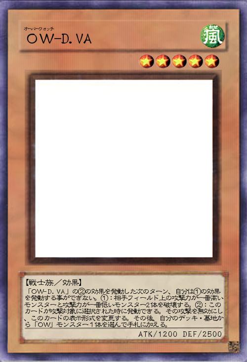 「オーバーウォッチハマり過ぎてやばい!て、事で21体のモンスターと魔法・罠作るつもりです。D.VAちゃんの①の効果はウルトを意識しました。が、メックが外れるので②は使えないようにしました。逆にD.VAちゃんは1度やられてもメックがあれば死なないので②の効果を入れました。