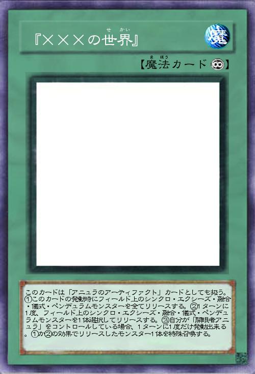 | このカードは「アニュラのアーティファクト」カードとしても扱う。①このカードの発動時にフィールド上のシンクロ・エクシーズ・融合・儀式・ペンデュラムモンスターを全てリリースする。②1ターンに1度、フィールド上のシンクロ・エクシーズ・融合・儀式・ペンデュラムモンスターを1体選択してリリースする。③自分が「開眼者アニュラ」をコントロールしている場合、1ターンに1度だけ発動出来る。①か②の効果でリリースしたモンスター1体を特殊召喚する。 | |||