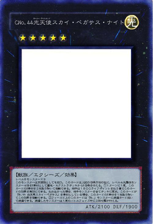 | レベル5モンスター×3 このモンスターは天使族としても扱う。このカードは上記の召喚方法の他に、レベル4光属性モンスター4体をX素材として墓地・エクストラデッキからX召喚を行える。①1ターンに1度、このカードのX素材を2枚取り除いて発動できる。相手は1500ライフポイントを払う事でこのカードの効果を無効にできる。払わなかった場合、相手モンスターを全てデッキに戻す。このカードが「No.44 白天馬スカイ・ペガサス」を素材としている場合、このカードのX素材を1枚取り除いてこの効果を発動できる。②フィールド上のこのカードは「No.」モンスターに装備カード扱いで装備できる。装備したモンスターは1度のバトルフェイズ中に2回攻撃が行える。 | |||
