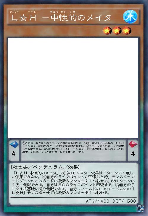 | 「L☆H 中性的のメイタ」の③のモンスター効果は1ターンに1度しか使用できない。①自分のライフポイントが回復した時、モンスターカードゾーンのこのカードに愛情カウンターを1つ載せる。②1ターンに1度、発動できる。自分は500ライフポイント回復する。③自分の手札を1枚墓地に送り発動できる。自分フィールドのこのカード以外の「L☆H」モンスター全てに愛情カウンターを1つ載せる。 | |||