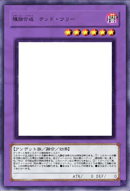 | アンデット族モンスター+植物族モンスター このカードは上記のカードを融合素材にした融合召喚でのみ特殊召喚できる。①:このカードが融合召喚に成功した場合に発動できる。自分フィールドに「枯れ葉トークン」(植物族・地・星1・攻/守0)を可能な限り特殊召喚する。このトークンはS素材にできない。②:1ターンに1度、自分フィールドの「枯れ葉トークン」1体をリリースし、以下の効果から1つを選択して発動できる。この効果は相手ターンでも発動できる。●自分は1200LP回復する。●自分はデッキから1枚ドローする。 | |||