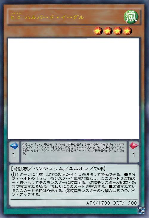 | ①1ターンに1度、以下の効果から1つを選択して発動できる。●自分フィールドの「bc」モンスター1体を対象とし、このカードを装備カード扱いとしてそのモンスターに装備する。装備モンスターが戦闘・効果で破壊される場合、代わりにこのカードを破壊する。●装備されているこのカードを特殊召喚する。②装備モンスターの攻撃力は500ポイントアップする。 | |||