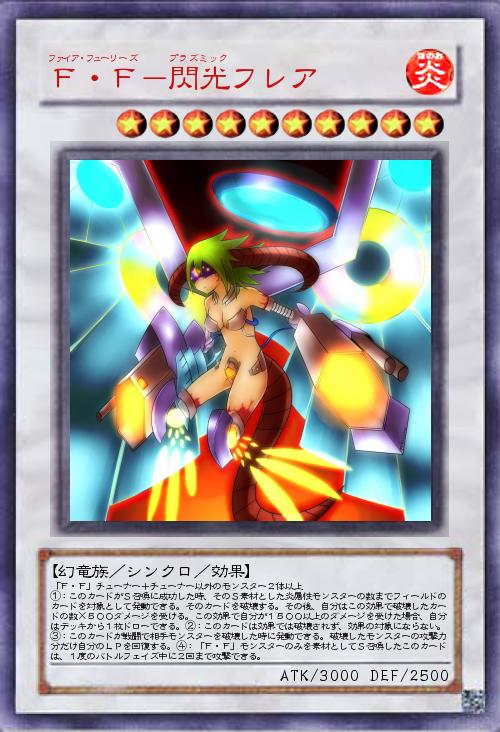 | 「F・F」チューナー+チューナー以外のモンスター2体以上 ①:このカードがS召喚に成功した時、そのS素材とした炎属性モンスターの数までフィールドのカードを対象として発動できる。そのカードを破壊する。その後、自分はこの効果で破壊したカードの数×500ダメージを受ける。この効果で自分が1500以上のダメージを受けた場合、自分はデッキから1枚ドローできる。②:このカードは効果では破壊されず、効果の対象にならない。③:このカードが戦闘で相手モンスターを破壊した時に発動できる。破壊したモンスターの攻撃力分だけ自分のLPを回復する。④:「F・F」モンスターのみを素材としてS召喚したこのカードは、1度のバトルフェイズ中に2回まで攻撃できる。 | |||