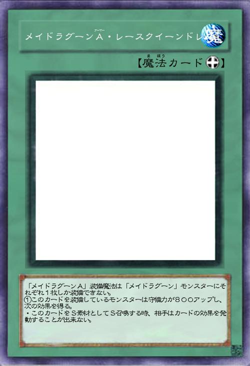 | 「メイドラグーンA」装備魔法は「メイドラグーン」モンスターにそれぞれ1枚しか装備できない。 ①このカードを装備しているモンスターは守備力が800アップし、次の効果を得る。 ・このカードをS素材としてS召喚する時、相手はカードの効果を発動することが出来ない。 | |||