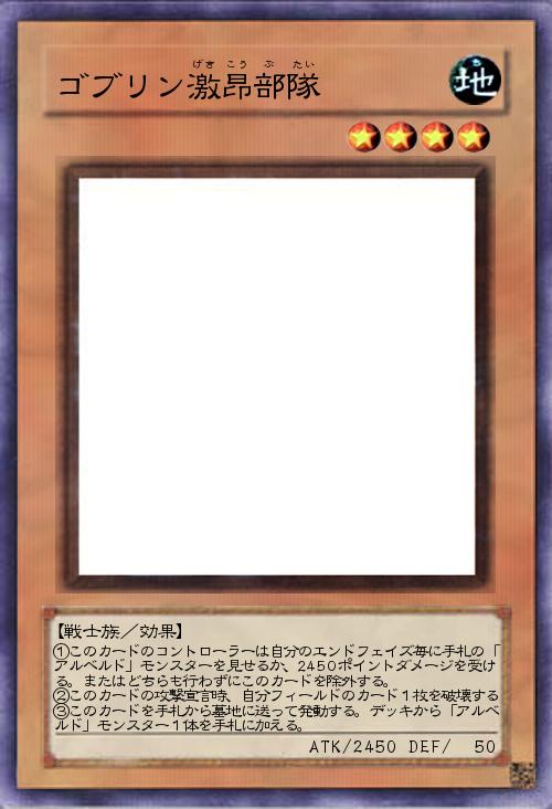 | ①このカードのコントローラーは自分のエンドフェイズ毎に手札の「アルベルド」モンスターを見せるか、2450ポイントダメージを受ける。またはどちらも行わずにこのカードを除外する。 ②このカードの攻撃宣言時、自分フィールドのカード1枚を破壊する ③このカードを手札から墓地に送って発動する。デッキから「アルベルド」モンスター1体を手札に加える。 | |||