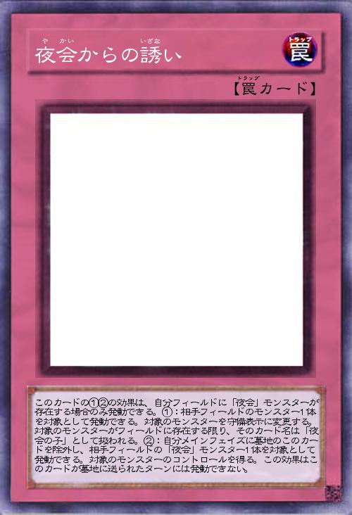| このカードの①②の効果は、自分フィールドに「夜会」モンスターが存在する場合のみ発動できる。①:相手フィールドのモンスター1体を対象として発動できる。対象のモンスターを守備表示に変更する。対象のモンスターがフィールドに存在する限り、そのカード名は「夜会の子」として扱われる。②:自分メインフェイズに墓地のこのカードを除外し、相手フィールドの「夜会」モンスター1体を対象として発動できる。対象のモンスターのコントロールを得る。この効果はこのカードが墓地に送られたターンには発動できない。 | |||