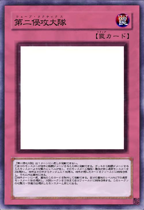 | 「第二侵攻大隊」は1ターンに一度しか発動できない。 ①自分のモンスターが相手に戦闘ダメージを与えた時に発動できる。デッキから戦闘ダメージを与えたモンスターより攻撃力とレベルが低く、そのモンスターと種族・属性が同じ通常モンスターを2体選択し、相手はその中からランダムに1枚選ぶ。相手が選んだカードをフィールドに特殊召喚し、それ以外は墓地に送る。 ②相手ターンに一度、墓地のこのカードを除外して発動できる。自分の墓地のレベル4以下の通常モンスター1体を選択し、大隊トークンを2体まで自分フィールドに特殊召喚する。このトークンの攻撃力・守備力は選択したモンスターと同じになる。 | |||